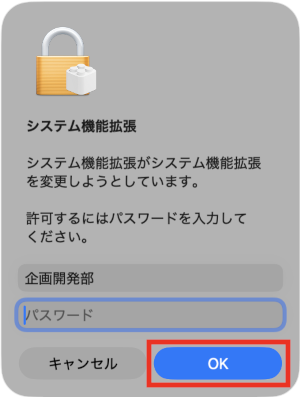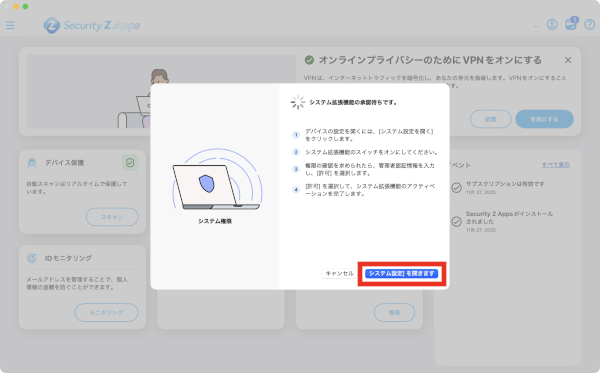 4システム拡張機能の承認待ちと表示されるため、「[システム設定]を開きます」をクリックします