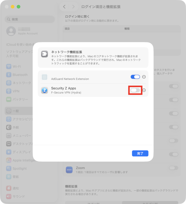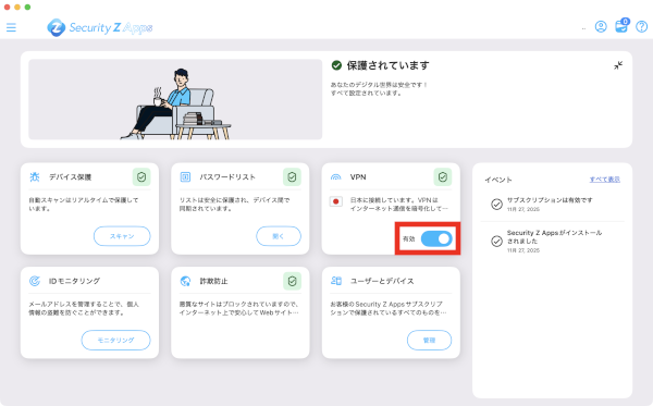 5Security Z Appsの横のトグルをクリックし、管理者権限が求められるため、デバイスのパスワードを入力し「OK」をクリックします。