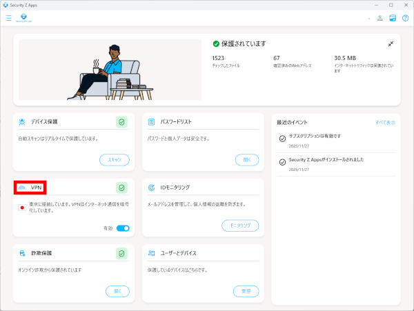 1Security Z Apps を起動し、「VPN」をクリックします。