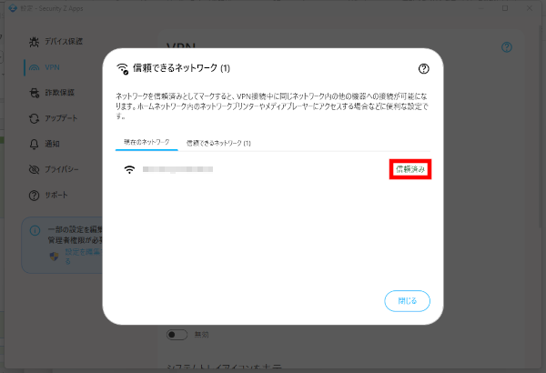 5現在のネットワークで設定したWi-Fiネットワークに「信頼済み」と表示されることを確認し、設定は完了です。