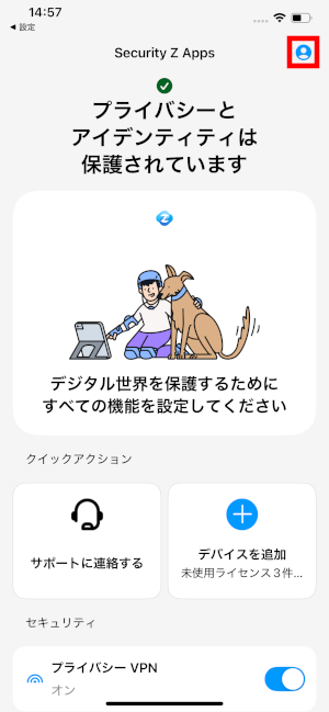 1Security Z Apps を起動し、右上の顔のアイコンをタップしてください。