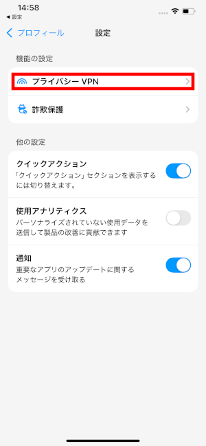 プライバシーVPNがオンの状態で、同じWi-Fiネットワークに接続しているプリンター、パソコン、テレビやストレージなどの機器に接続ができない場合、下記手順をお試しください。