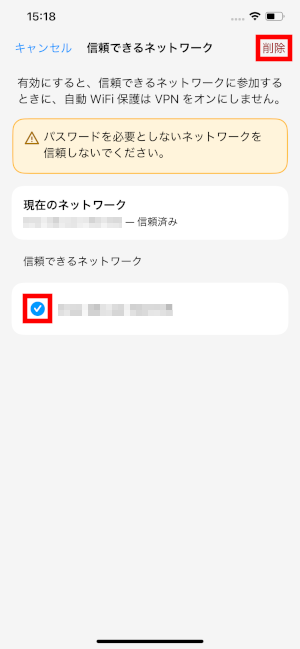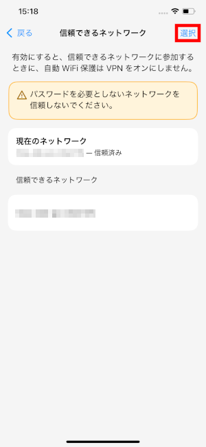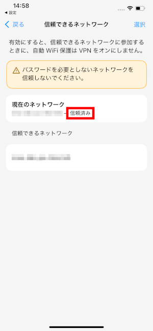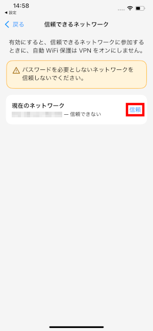 4信頼できるネットワークとして設定したいネットワークの欄にある「信頼」をタップしてください。